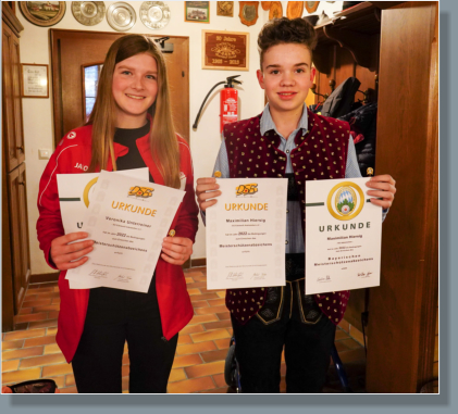 Ehrungen unserer Jungschützen für das Jahr 2022Das Meisterschützenabzeichen des BSSB im Jahr 2022 erhielten:Veronika UnterreinerMaxi HiersigKatharina SchindlerMichael DinklerDas Meisterschützenabzeichen des DSB erhielten:Veronika UnterreinerMaxi Hiersig
