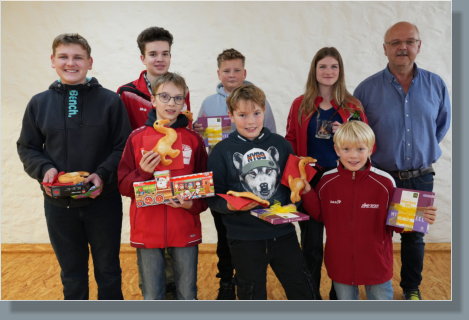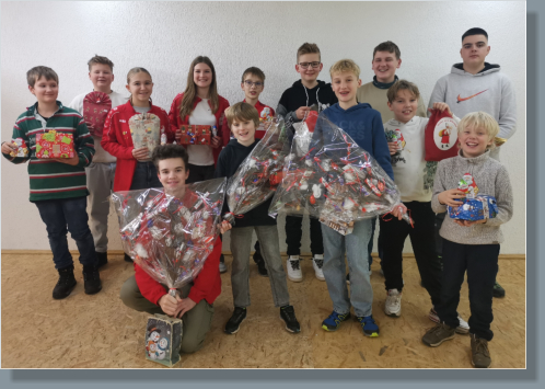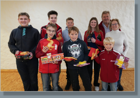 Nikolausschießen der Adelstettener Schützen Auch dieses Jahr war es wieder ein lustiger Abend beim Nikolausschießen der Adelstettener Schützen. Dabei sollten nicht die Ergebnisse, sondern der Spaß im Vordergrund stehen. Den Anfang machten die Jungschützen. Die drei begehrten, mit Süßigkeiten geschmückten Ruten wurde auf Jux ausgeschossen. Hierbei wurden nur die Zehntel-Ringe, also die Stelle nach dem Komma zusammengezählt. Wer am nächsten an der geheimen Vorgabe dran war, gewinnt das Nikolausschießen. Nachdem alle 13 Jungschützen ihre Schüsse abgegeben hatten, wurde es spannend, denn die Ergebnisse wurden genannt. Die vorgegebene Zahl war 31 und die wurde ganz genau von Niklas Bösl erzielt. Damit gewann er das Jugend-Nikolausschießen und konnte sich über eine der drei Ruten freuen. Den zweiten Platz erzielte Leopold Schmid mit 27 Punkten und damit einer Differenz von 4 Punkten knapp vor Maxi Hiersig, der mit 26 und einer Differenz von 5 Punkten den dritten Platz erzielte. Beide freuten sich ebenfalls über jeweils eine der schönen Ruten. Anschließend wurde gewichtelt. Dazu brachte jeder Jungschütze ein Päckchen mit, das mit einer Nummer versehen wurde. Dieses Jahr wurden die Wichtel-Päckchen auf Nüsse ausgeschossen. Dazu wurden Walnüsse ebenfalls mit den Nummern versehen und auf einen Ast gebunden. Danach konnte jeder Jungschütze eine Nuss abschießen. Die Nummer der abgeschossenen Nuss wurde unter den Wichtel-Päckchen gesucht, so wurden die neuen Päckchenbesitzer ermittelt. Danach wurden eifrig die Geschenke ausgepackt. Einige der vielen Leckereien wurden gleich verspeist, so ließen die Jungschützen ihren Abend ausklingen. Währenddessen begaben sich die Erwachsenen an den Schießstand. Auch hier gab es drei schön geschmückte Ruten zu gewinnen. Diese wurden auch beim Nussen- Schießen ermittelt. Dazu wurden wieder mit Nummern beschrifteten Walnüsse an einen Ast gebunden. Danach konnte jeder Erwachsene maximal drei Schüsse abgeben und die Nummer der erzielten Nuss wurde beim Schützen notiert. Einige erzielten gleich mit dem ersten Schuss eine Nuss, andere machten es spannend und benötigten alle drei Schüsse. Mancher schaffte es jedoch nicht eine Nuss zu treffen und schied aus dem Rennen um die Ruten aus. Für die ausgeschiedenen Teilnehmer gab es anschließend noch ein Trostpreisschießen. Dazu konnte jeder nochmal mit einem Schuss versuchen eine Nuss zu treffen. Danach wurde es für die Schützen, die eine Nuss im ersten Durchgang getroffen haben, spannend, denn die drei Ruten wurden ausgelost. Das Losglück hatten Franz Schindler, Georg Ließel und Robin Ballwein. Sie konnten sich über die drei Ruten und damit über den Sieg des Nikolausschießens freuen. Anschließend wurde für alle, die im zweiten Durchgang noch eine Nuss getroffen hatten, der Trostpreis, ein Six-Pack Bier, gezogen. Das Losglück hatte schließlich Andreas Feil. Nach der Siegerehrung feierten die Schützen beim Kerzenschießen, Kickern oder gemütlichen Zusammensitzen noch lange weiter.